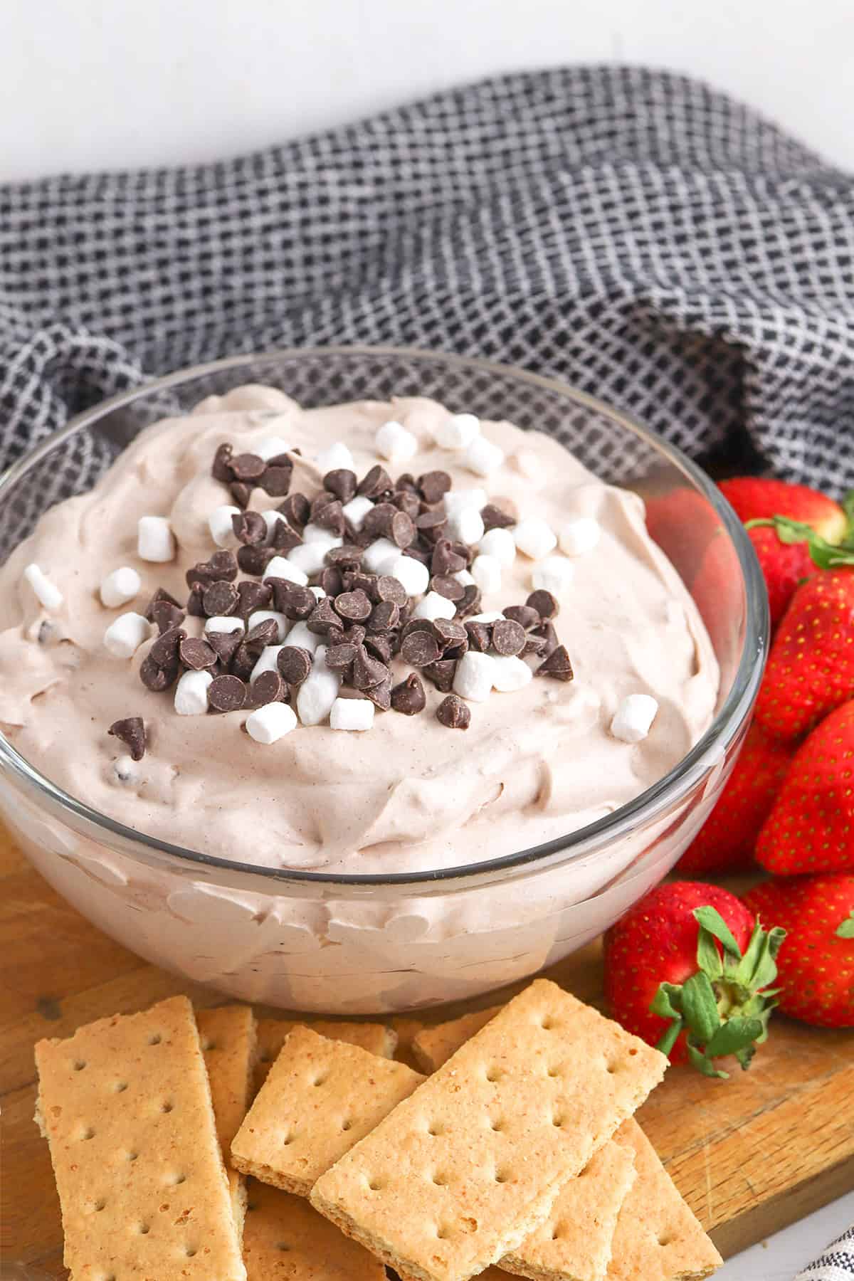 You can serve it with graham crackers, mini chocolate chip cookies, pretzels, Oreos, animal crackers, vanilla wafers, etc.